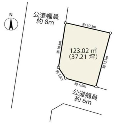 | 現況/引渡し | 更地/即時 | 接道状況 | 接道: 南 公道 道路幅: 6m 接道: 西 公道 道路幅: 8m |